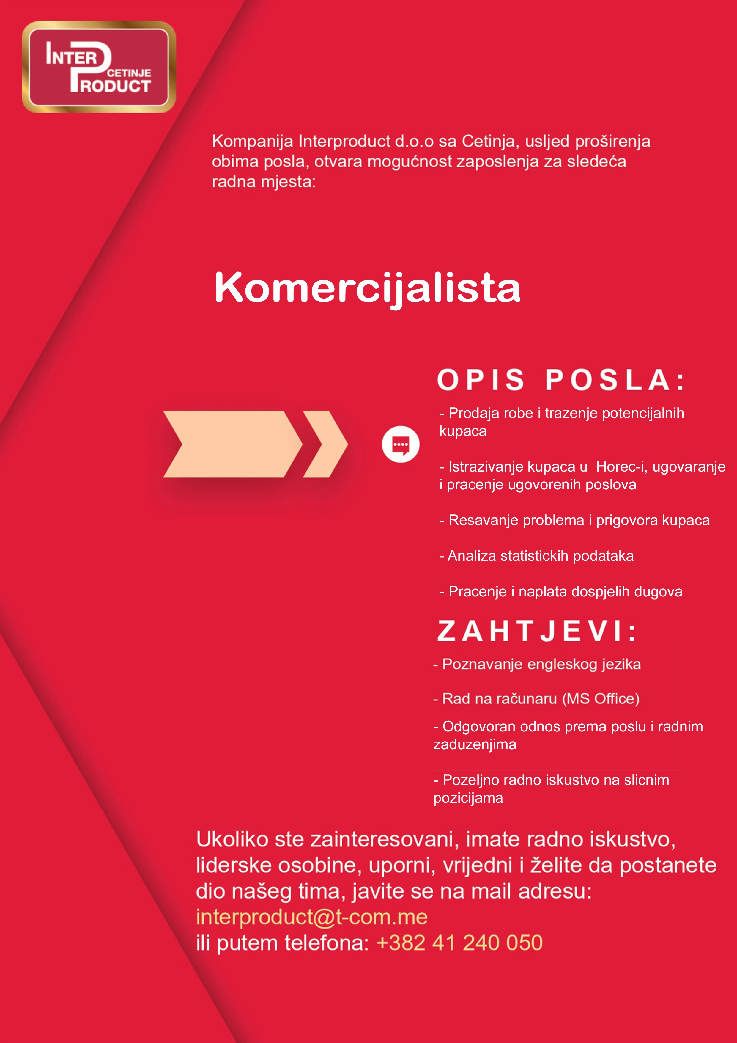 Ukoliko ste zainteresovani, imate radno iskustvo, volite timski rad, uporni, spremni za usavršavanje i napredovanje, vrijedni i želite da postanete dio našeg tima, javite se na mail adresu: interproduct@t-com.me ili putem telefona: +382 41 240 050 kao i putem opcije KONKURIŠITE.