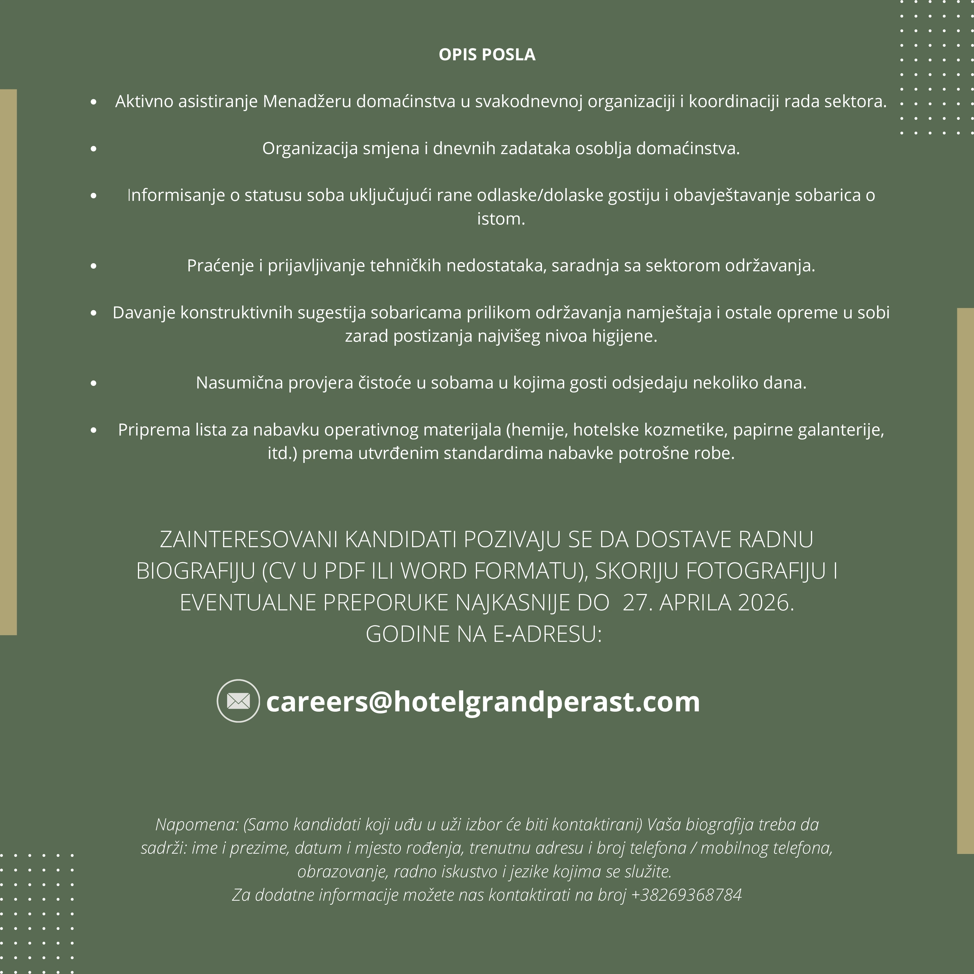 Pošaljite radnu biografiju-CV (PDF ili Word format), skoriju fotografiju i eventualne preporuke do 14.03.2026. na sljedeću e - adresu: careers@hotelgrandperast.com