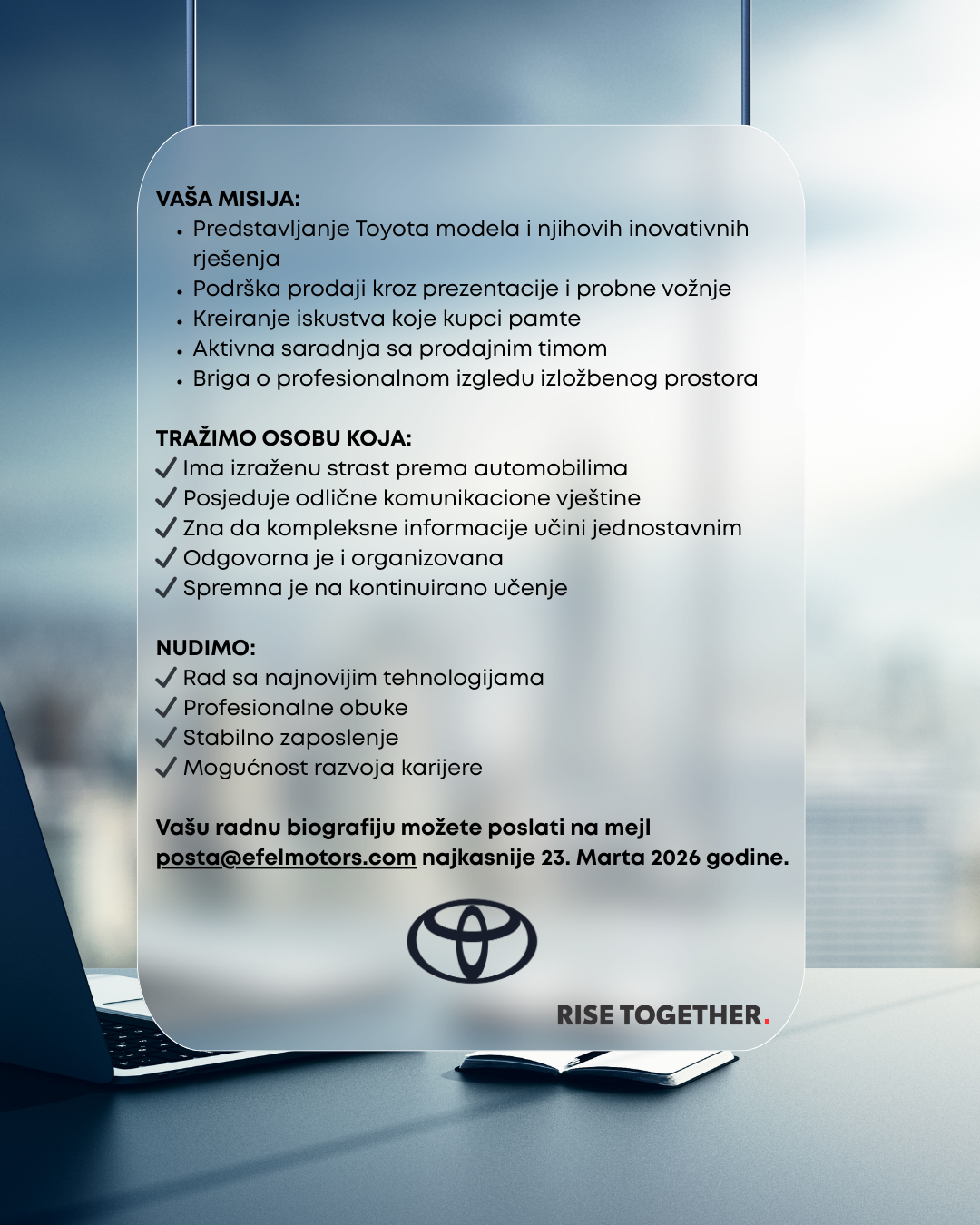 Vašu radnu biografiju možete poslati na mail adresu: posta@efelmototrs.com, najkasnije do 23. marta 2026. godine.