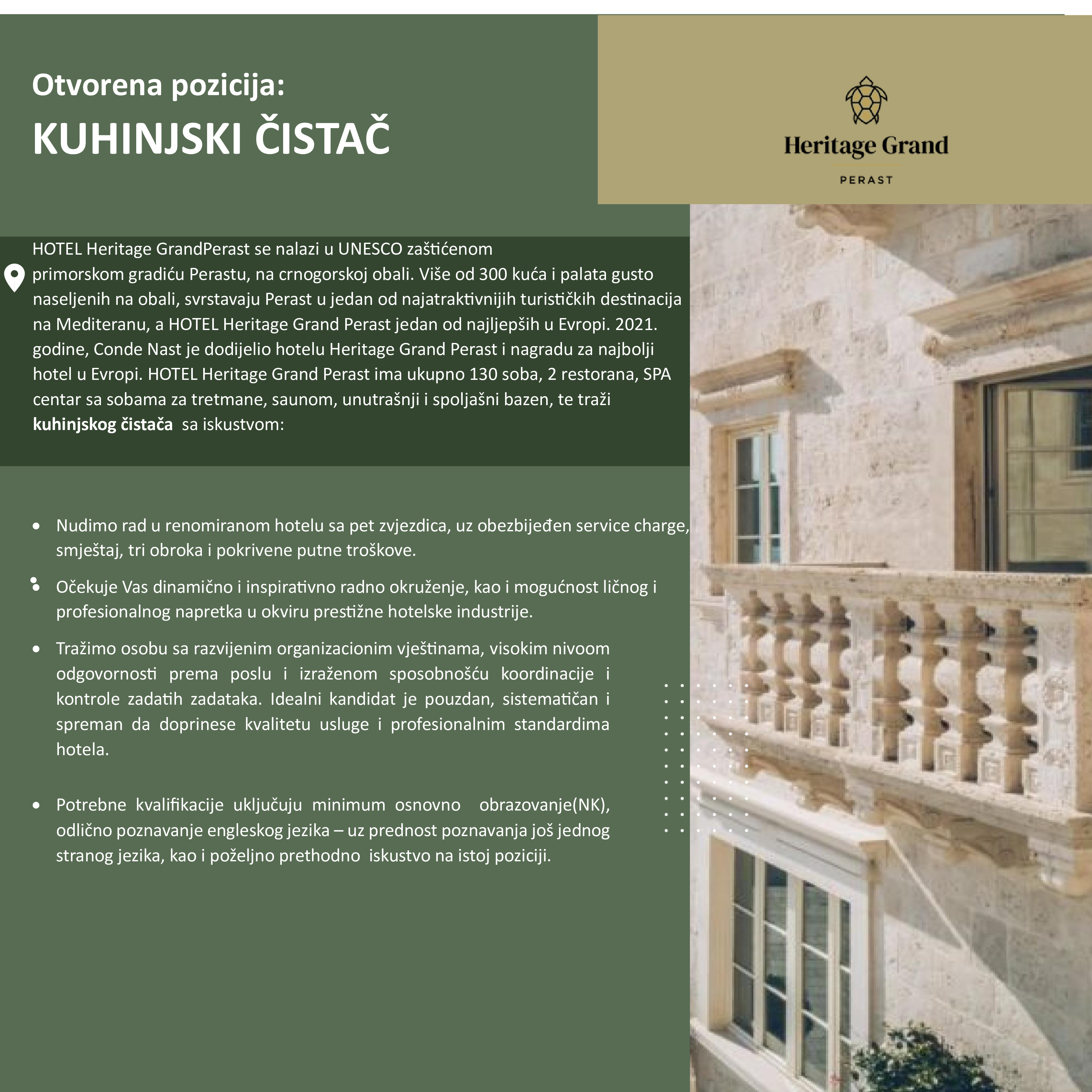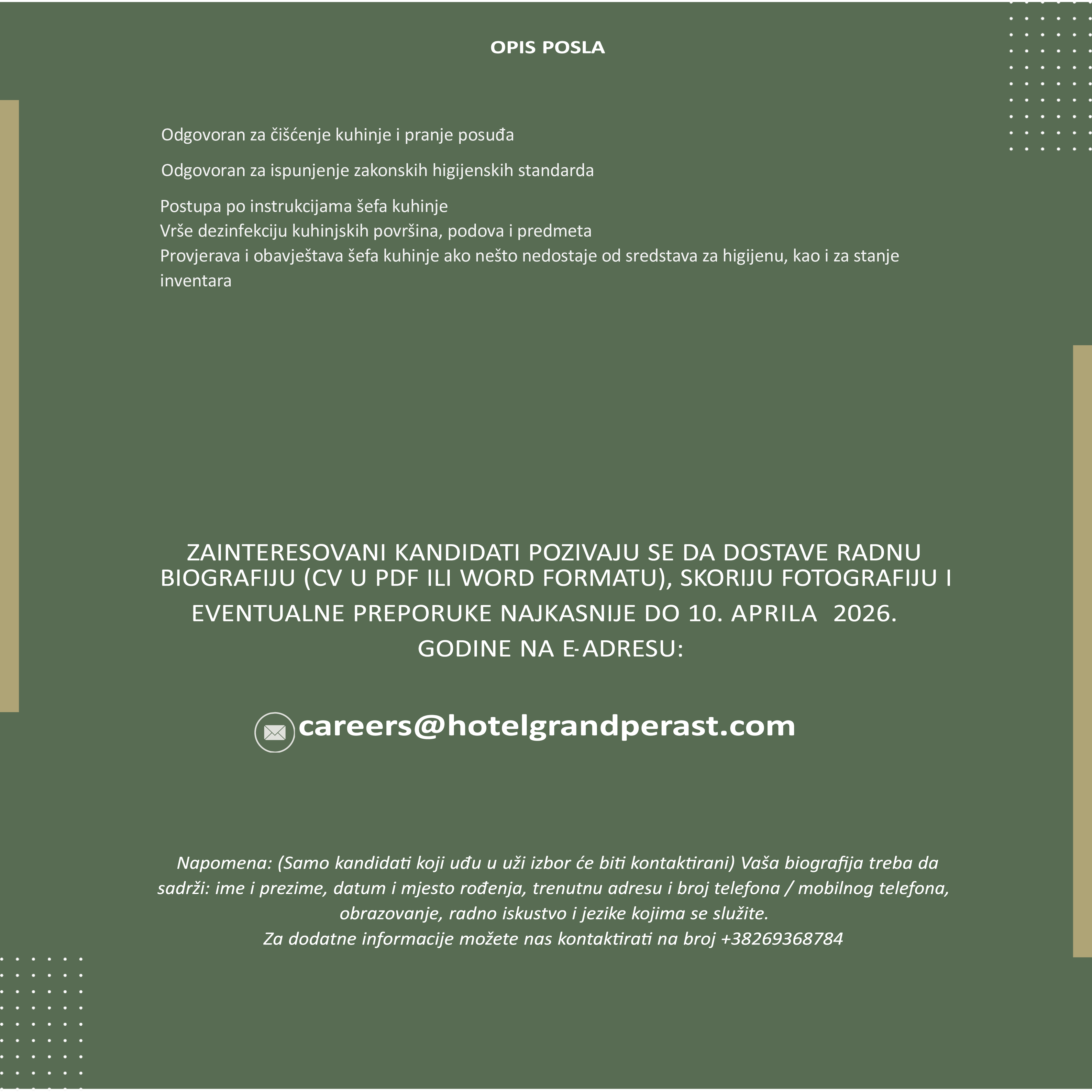 Zainteresovani kandidati pozivaju se da dostave radnu biografiju (CV u PDF ili Word formatu), skoriju fotografiju i eventualne preporuke najkasnije do 10. aprila 2026. godine na e-adresu: careers@hotelgrandperast.com