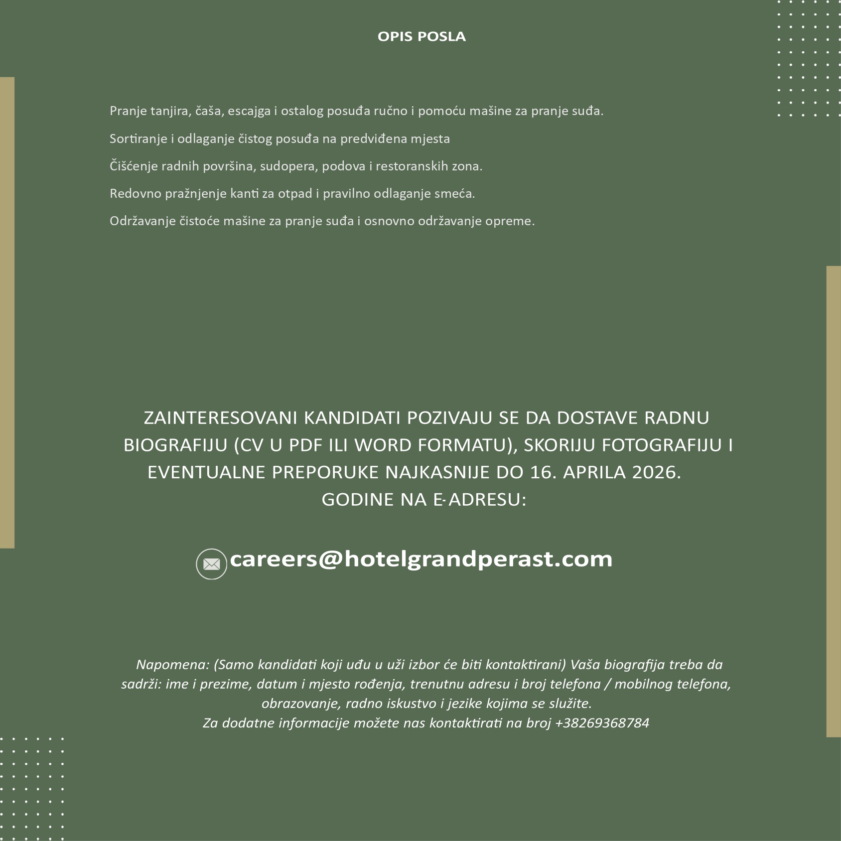 Zainteresovani kandidati pozivaju se da dostave radnu biografiju (CV u PDF ili Word formatu), skoriju fotografiju i eventualne preporuke najkasnije do 16. aprila 2026. godine na e-adresu: