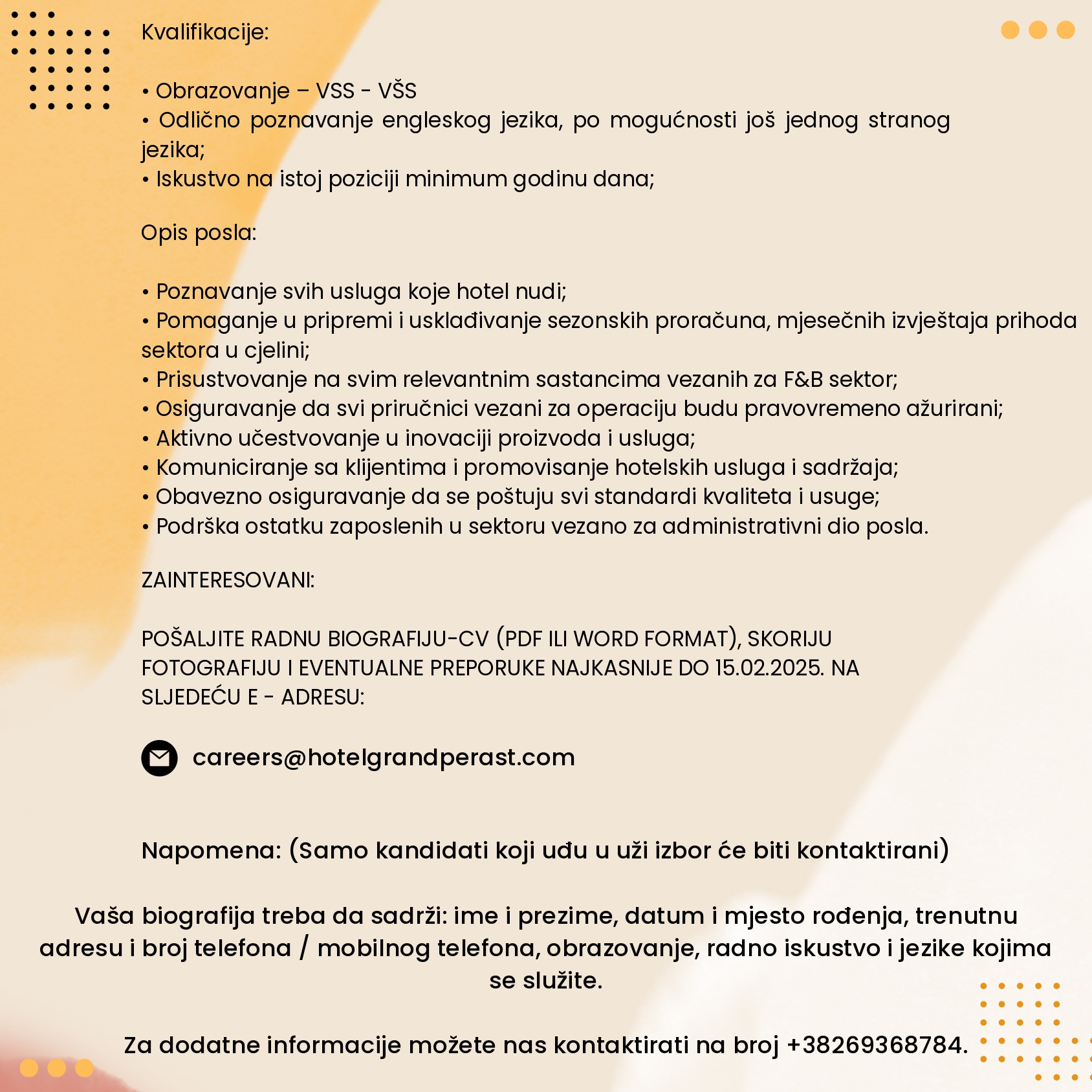 Pošaljite radnu biografiju-CV (PDF ili Word format), skoriju fotografiju i eventualne preporuke do 15.02.2025. na sljedeću e - adresu: