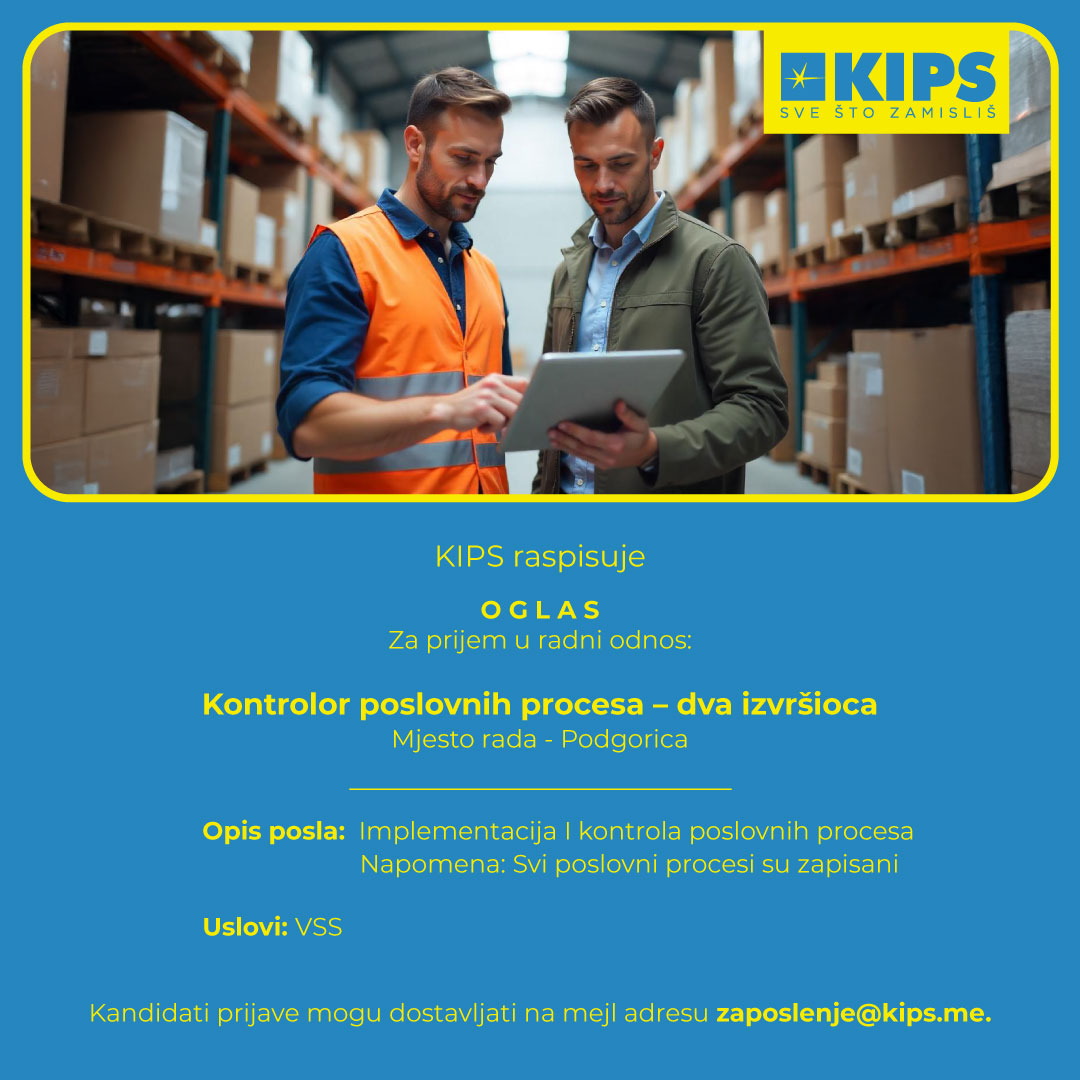 Postanite član lidera na tržištu i razvijajte karijeru u kompaniji koja pruža odlične uslove za rast i razvoj zaposlenog. Nudimo obuku, mogućnost stalnog zaposlenja, priliku da napredujete i budete plaćeni najviše u branši. Prijave za zaposlenje, koje uključuju CV poslati na mail zaposlenje@kips.me  ili dostaviti u najbliži naš centar sa oznakom “za oglas”.