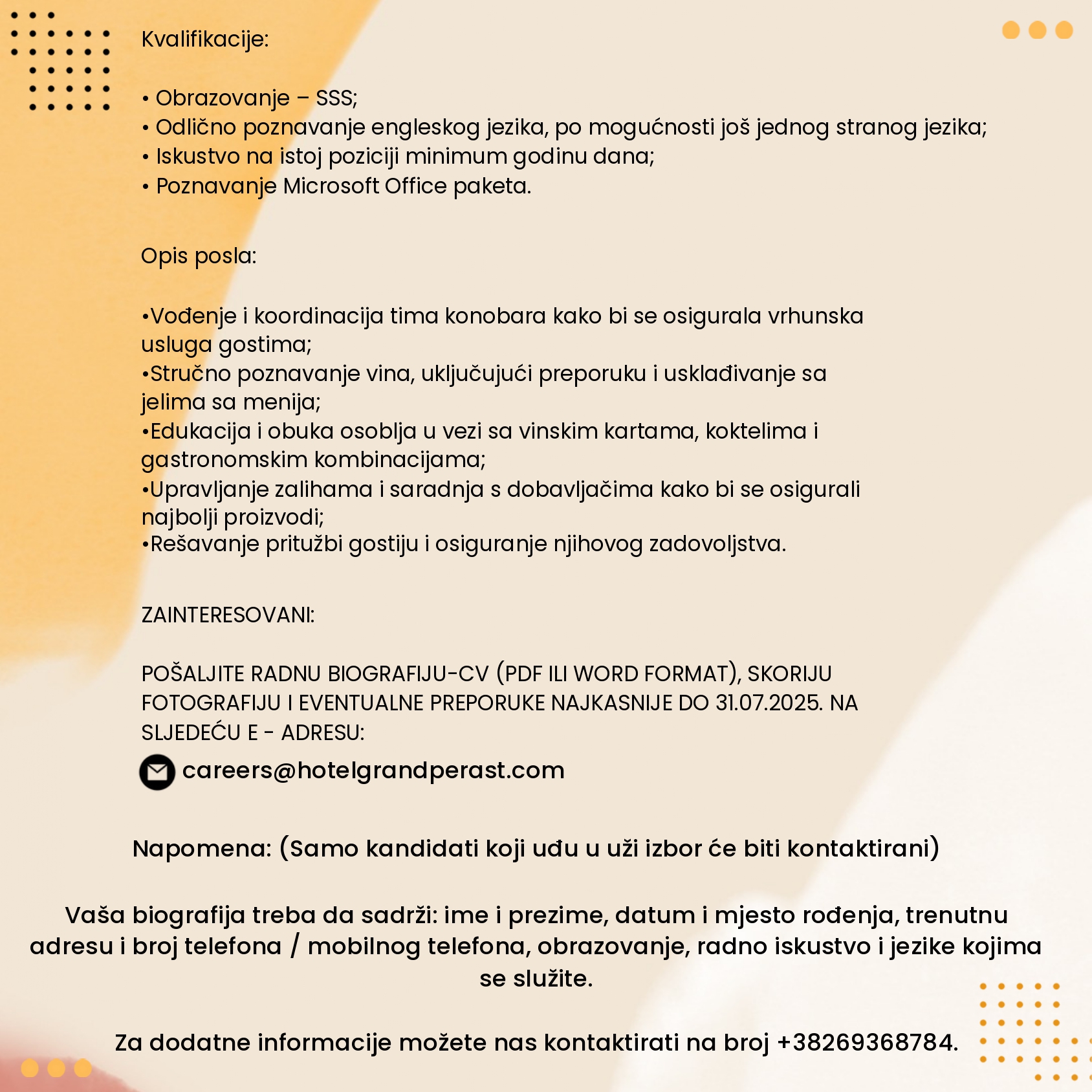Pošaljite radnu biografiju-CV (PDF ili Word format), skoriju fotografiju i eventualne preporuke do 31.07.2025. na sljedeću e - adresu: