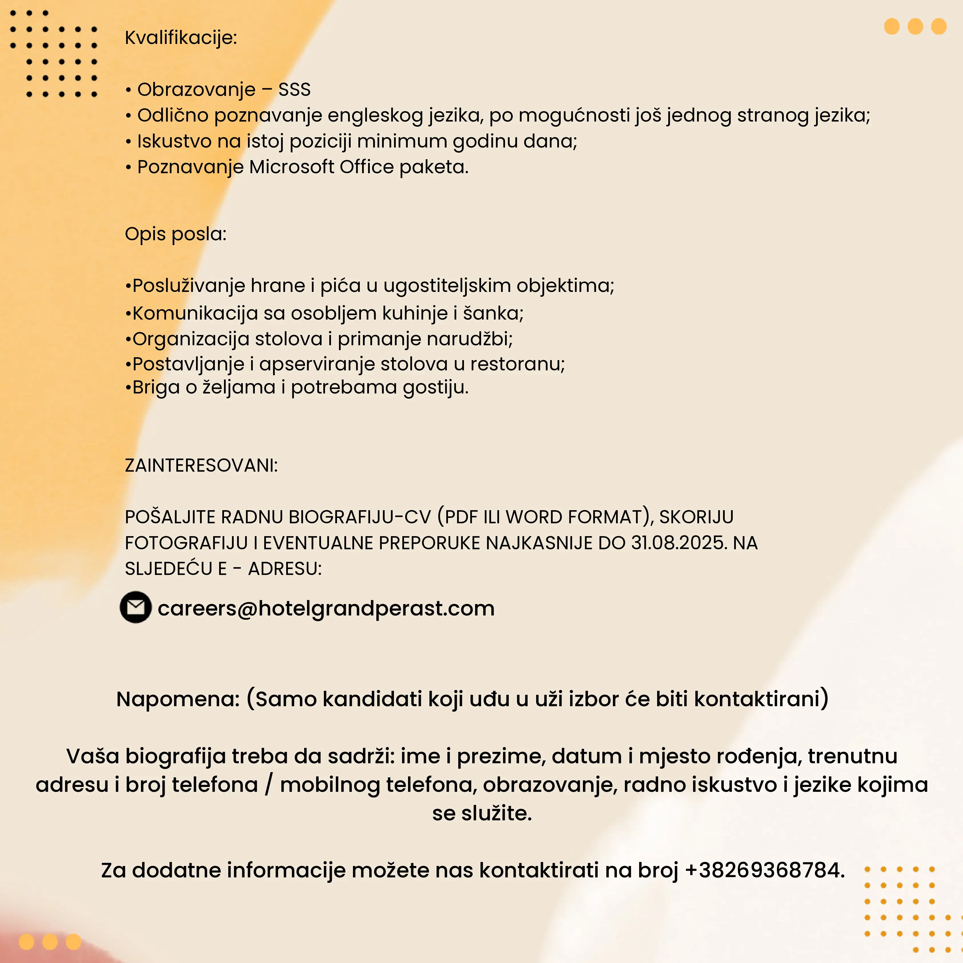 Pošaljite radnu biografiju-CV (PDF ili Word format), skoriju fotografiju i eventualne preporuke do 31.08.2025. na sljedeću e - adresu: