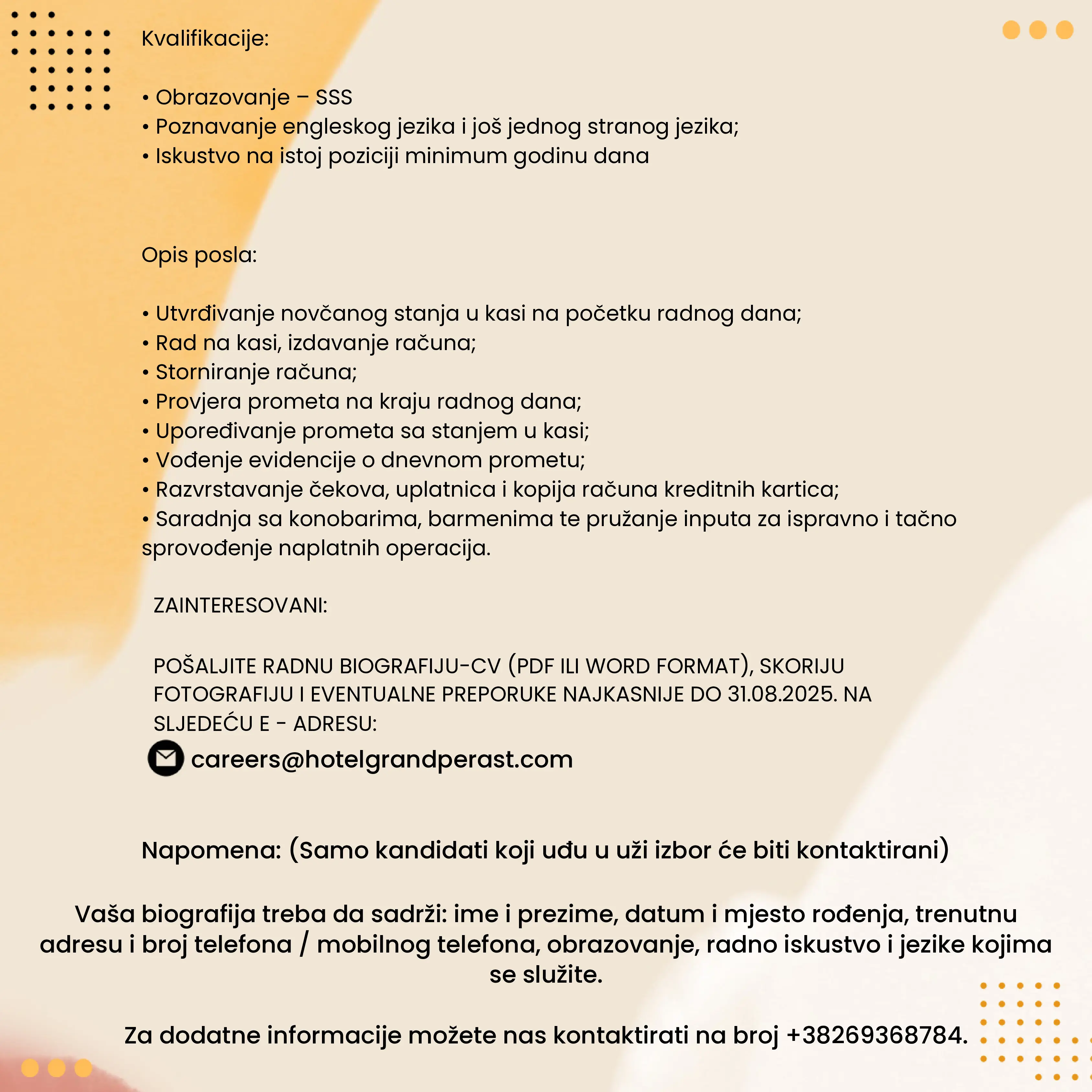 Pošaljite radnu biografiju-CV (PDF ili Word format), skoriju fotografiju i eventualne preporuke do 31.08.2025. na sljedeću e - adresu: