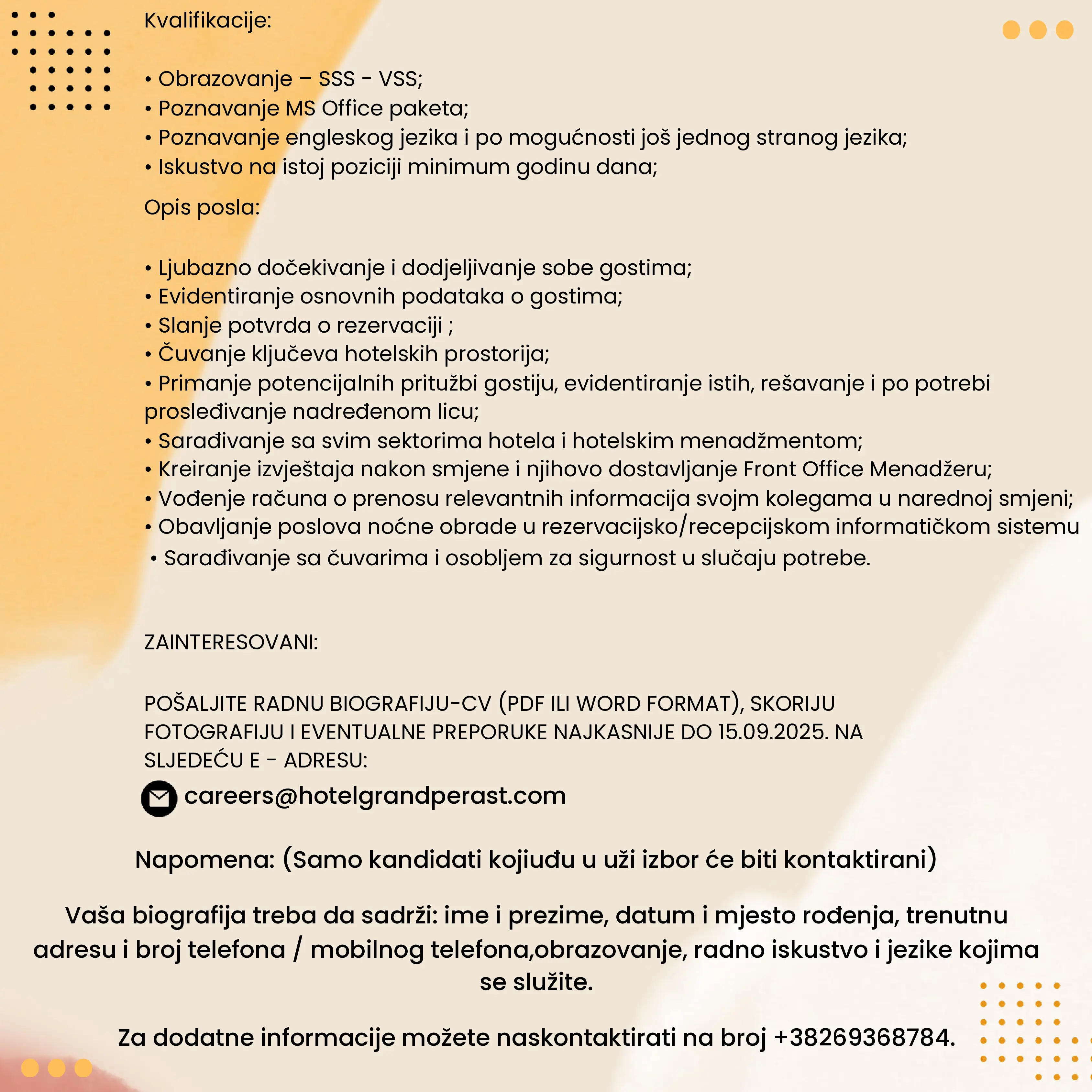 Pošaljite radnu biografiju-CV (PDF ili Word format), skoriju fotografiju i eventualne preporuke do 15.09.2025. na sljedeću e - adresu: