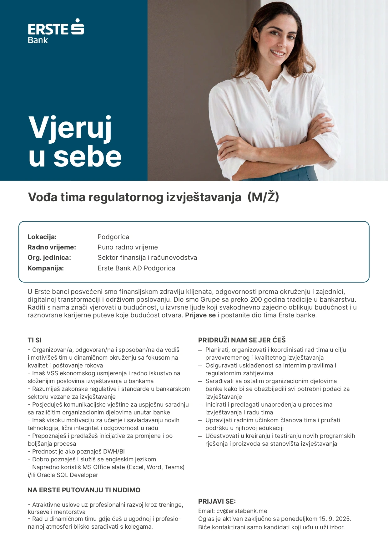 Vođa tima regulatornog izvještavanja (M/Ž)