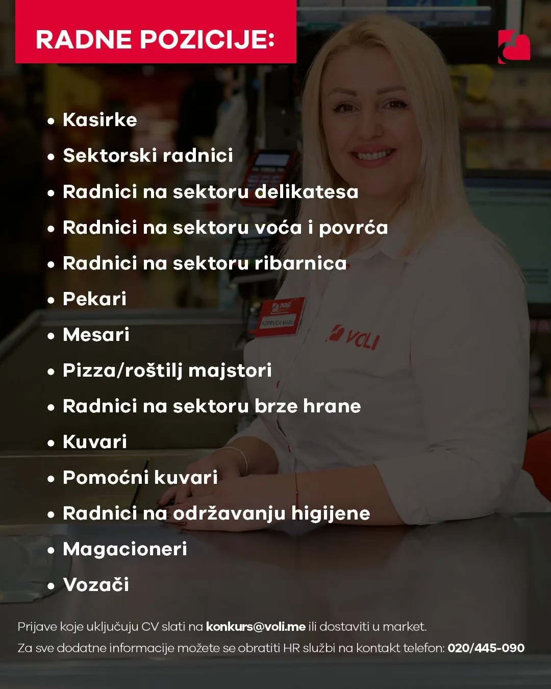 ​Pošalji svoj CV na konkurs@voli.me ili ga dostavi u najbliži Voli market.