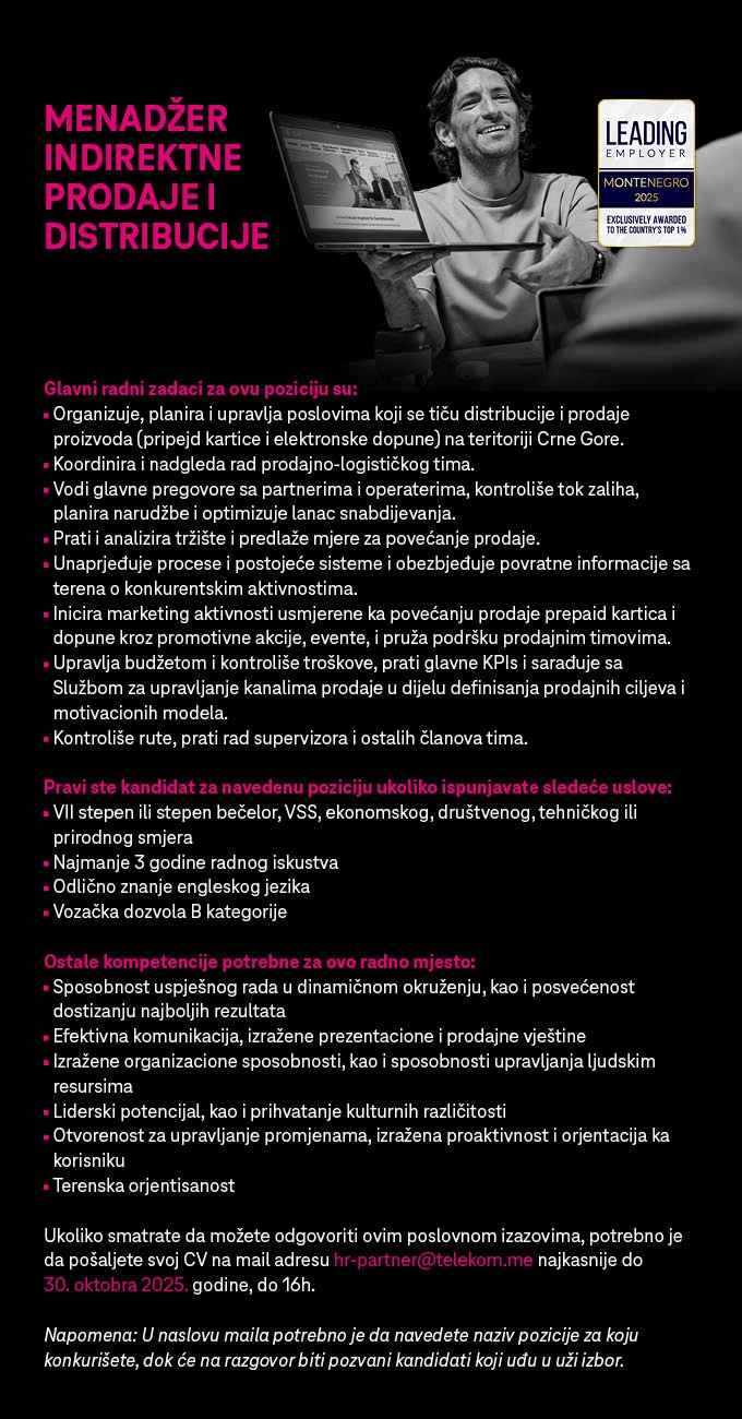 Ukoliko smatrate da možete odgovoriti ovim poslovnim izazovima, potrebno je da pošaljete svoj CV na mail adresu hr-partner@telekom.me ili putem opcije KONKURIŠITE