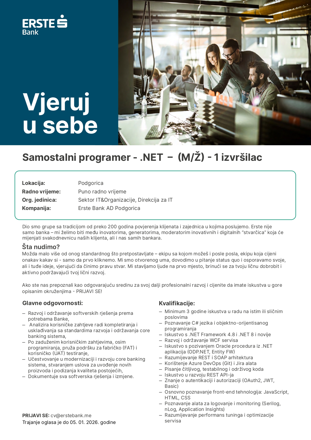 Oglas je aktivan zaključno sa ponedjeljkom 05.01.2026. godine