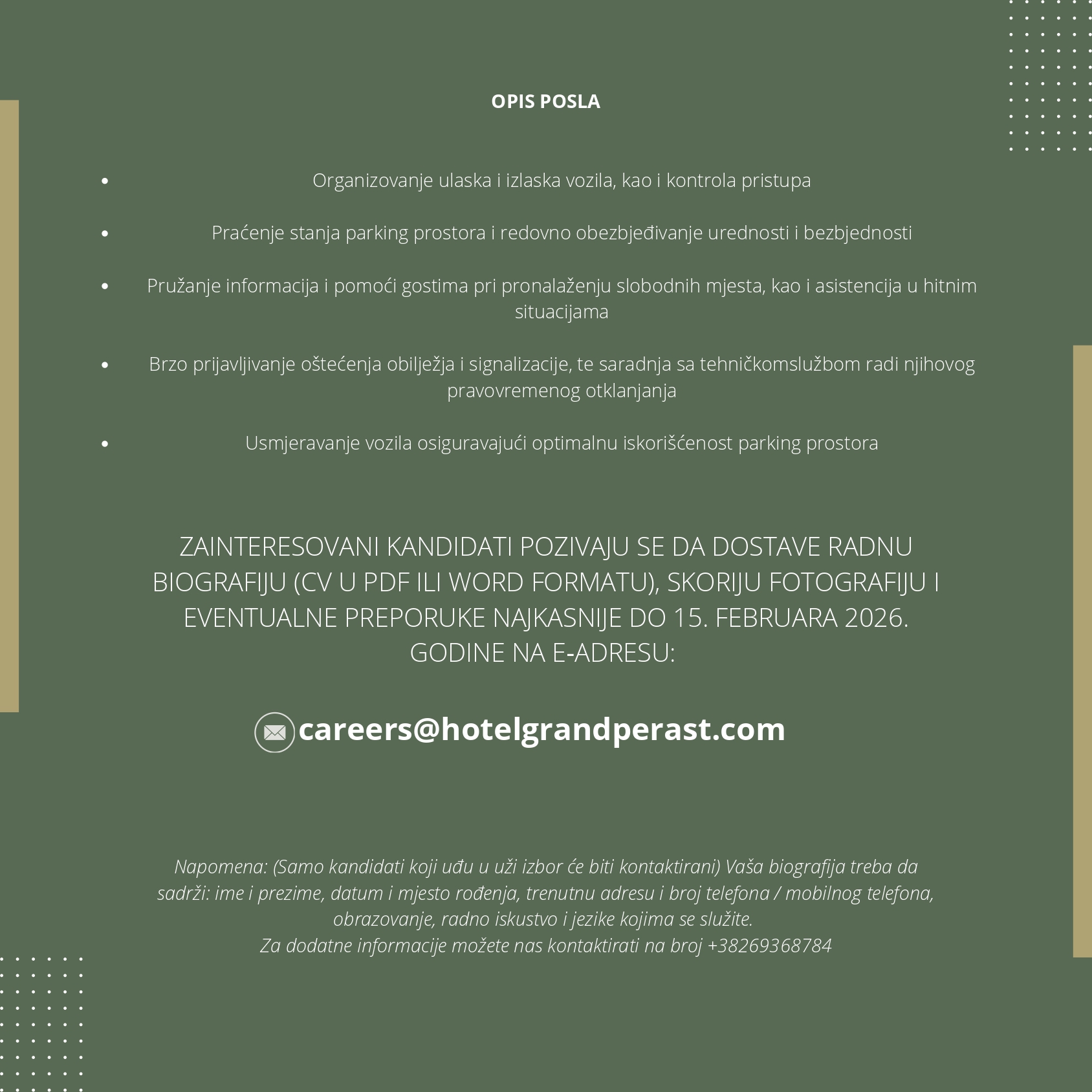 Zainteresovani kandidati pozivaju se da dostave radnu biografiju (CV u PDF ili Word formatu), skoriju fotografiju i eventualne preporuke najkasnije do 15. februara 2026. godine na e-adresu: