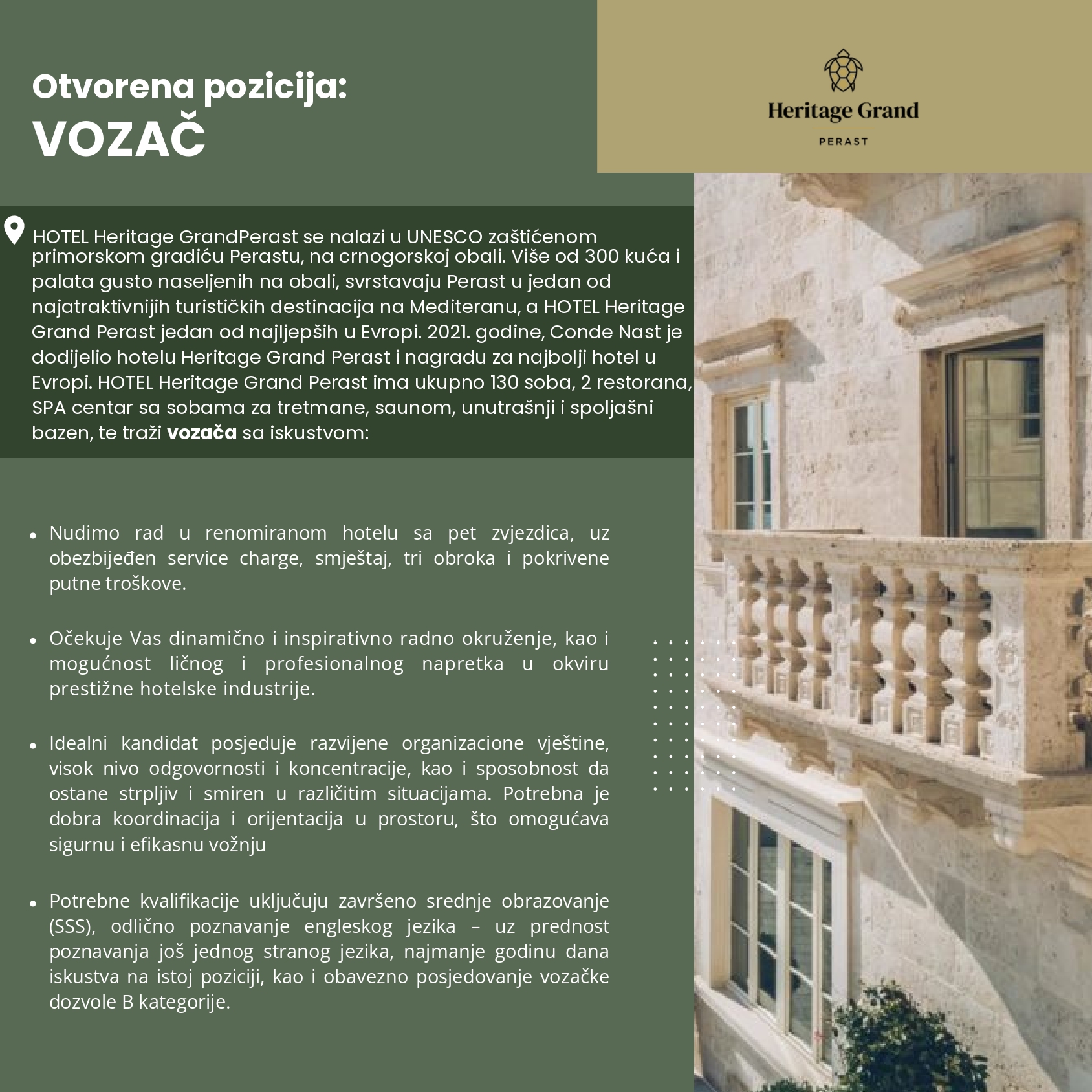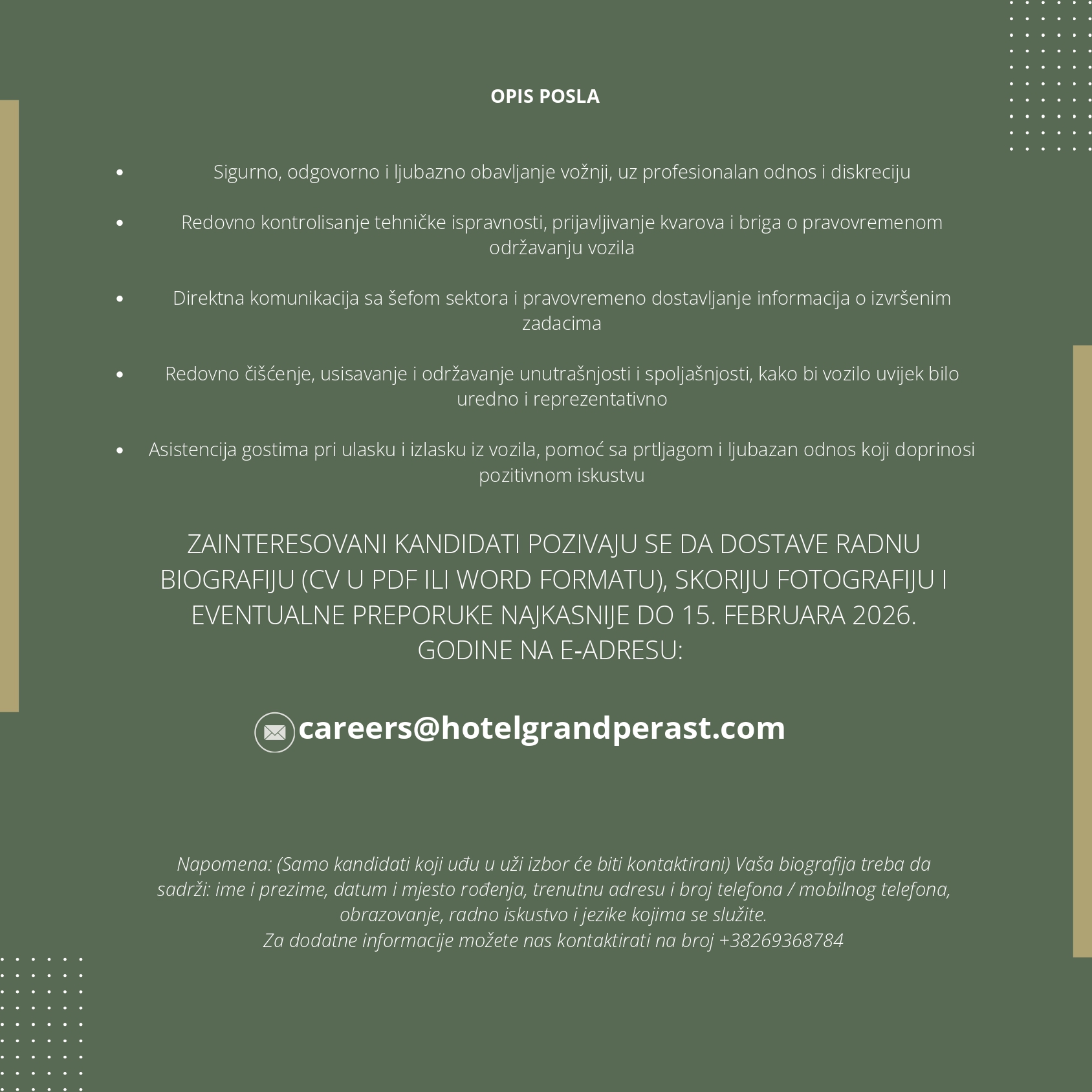 Zainteresovani kandidati pozivaju se da dostave radnu biografiju (CV u PDF ili Word formatu), skoriju fotografiju i eventualne preporuke najkasnije do 15. februara 2026. godine na e-adresu: careers@hotelgrandperast.com