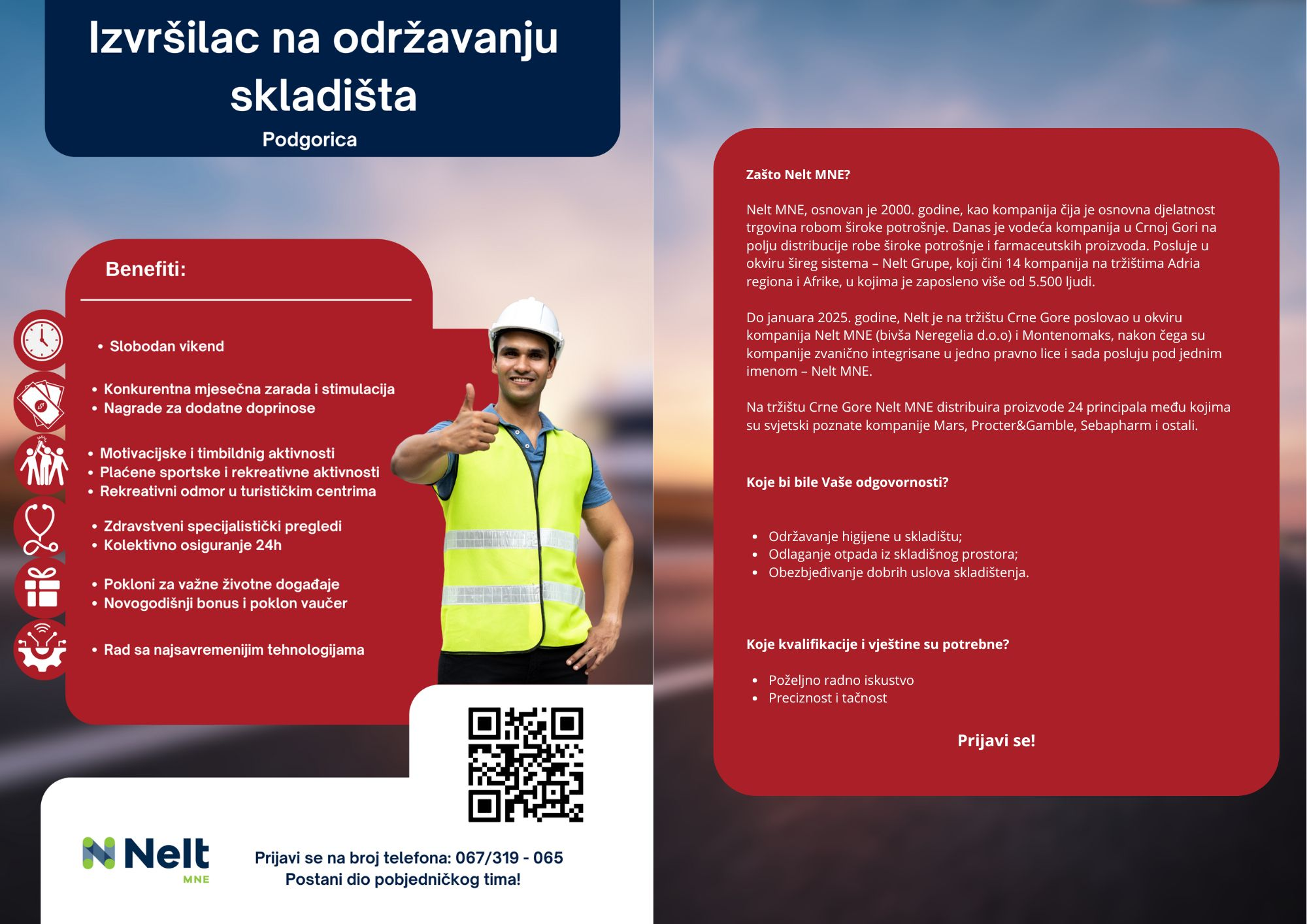 Nelt MNE, osnovan je 2000. godine, kao kompanija čija je osnovna djelatnost trgovina robom široke potrošnje. Danas je vodeća kompanija u Crnoj Gori na polju distribucije robe široke potrošnje i farmaceutskih proizvoda. Posluje u okviru šireg sistema – Nelt Grupe, koji čini 14 kompanija na tržištima Adria regiona i Afrike, u kojima je zaposleno više od 5.500 ljudi.