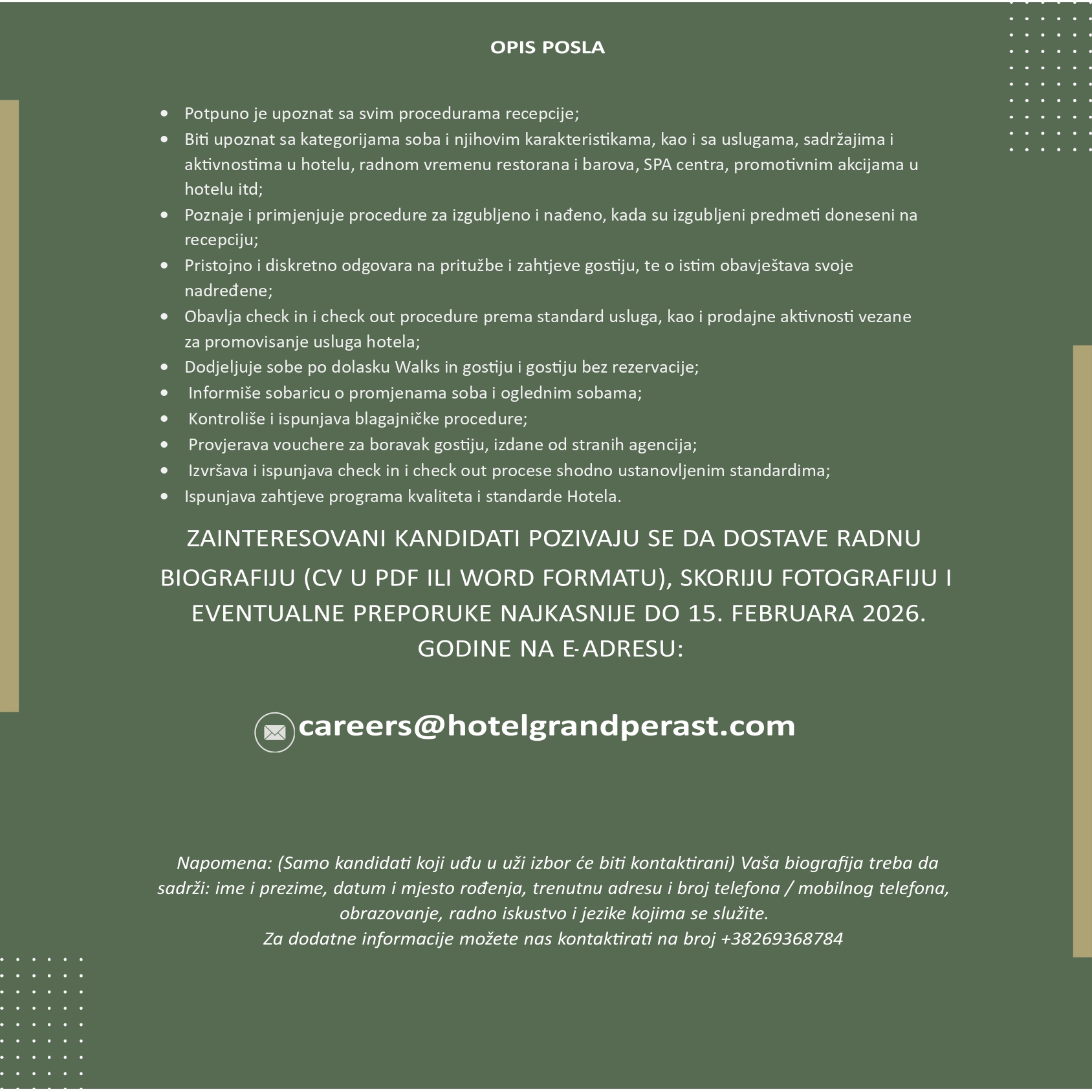 Zainteresovani kandidati pozivaju se da dostave radnu biografiju (CV u PDF ili Word formatu), skoriju fotografiju i eventualne preporuke najkasnije do 15. februara 2026. godine na e-adresu: careers@hotelgrandperast.com