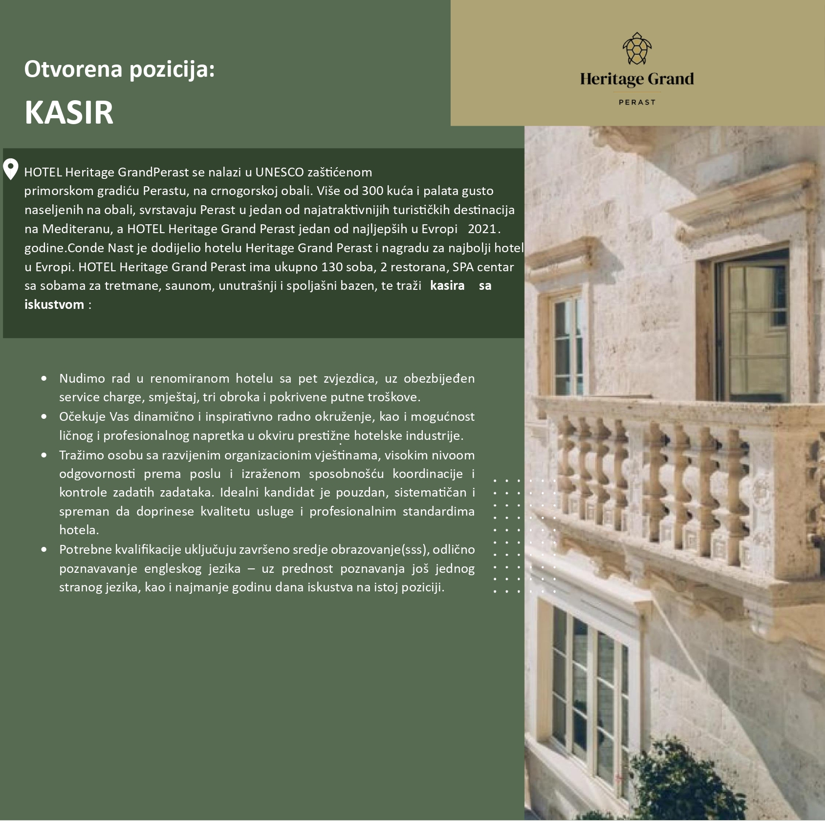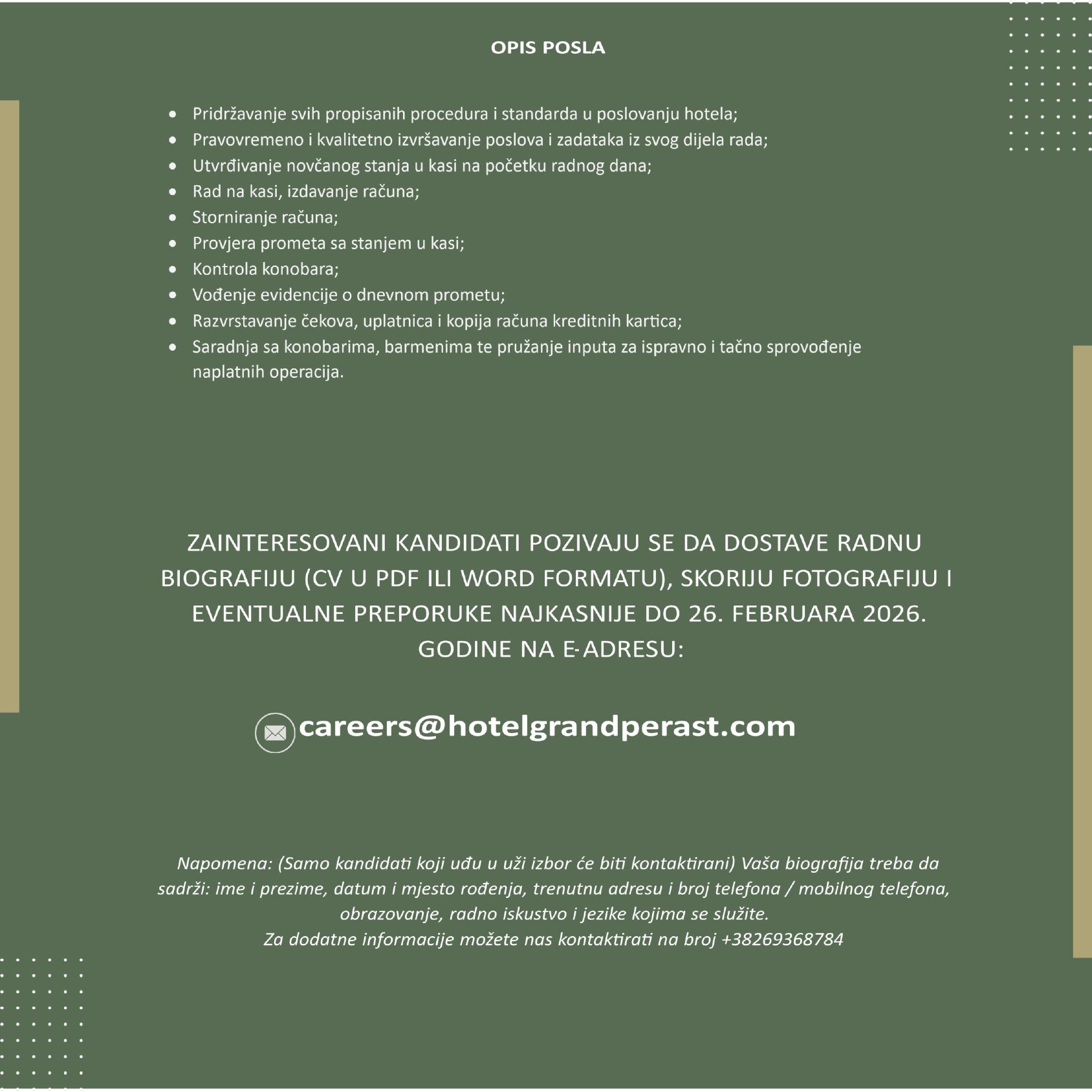 Zainteresovani kandidati pozivaju se da dostave radnu biografiju (CV u PDF ili Word formatu), skoriju fotografiju i eventualne preporuke najkasnije do 26. februara 2026. godine na e-adresu: careers@hotelgrandperast.com